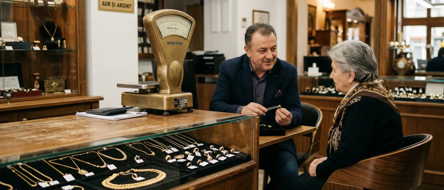 - Calculul se bazează pe prețul actual al aurului (662.09 lei/gram pentru 24k în aprilie 2026), caratajul obiectului, greutatea și starea de conservare. Evaluarea se face cu echipamente profesionale în prezența clientului pentru transparență maximă.